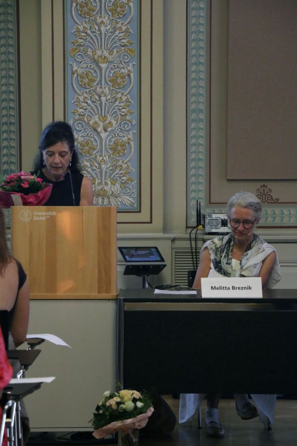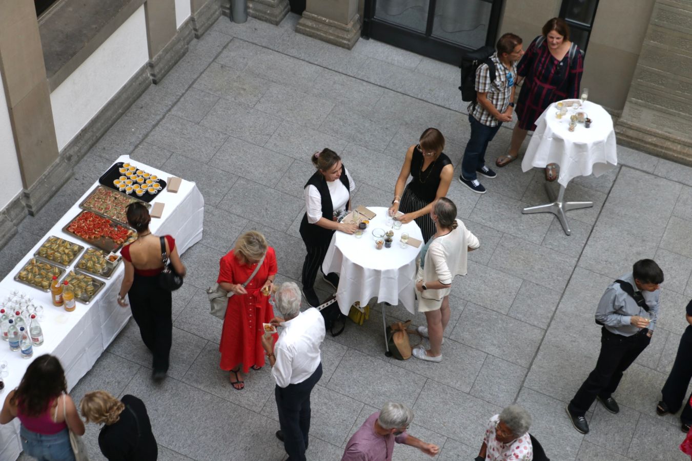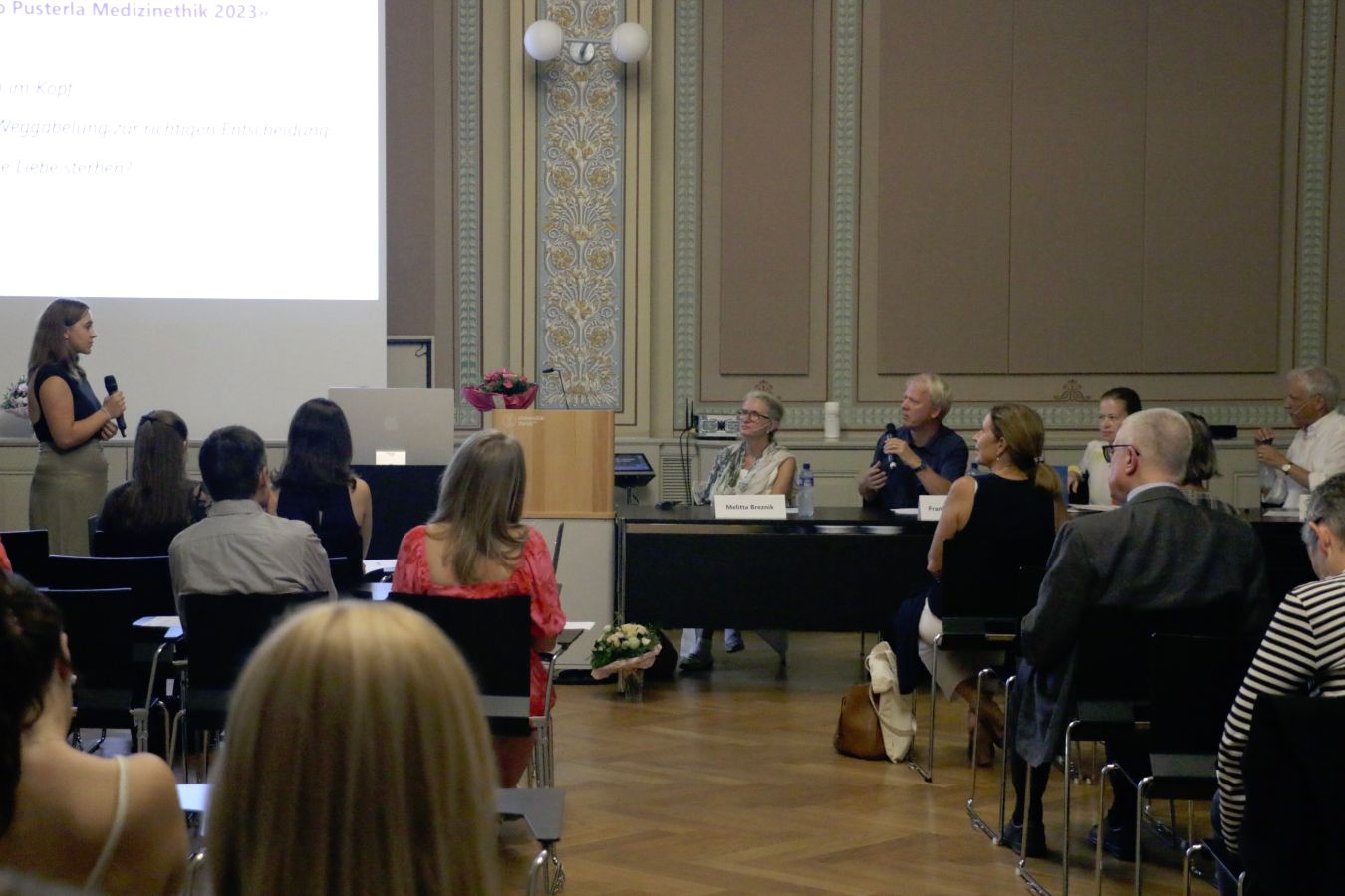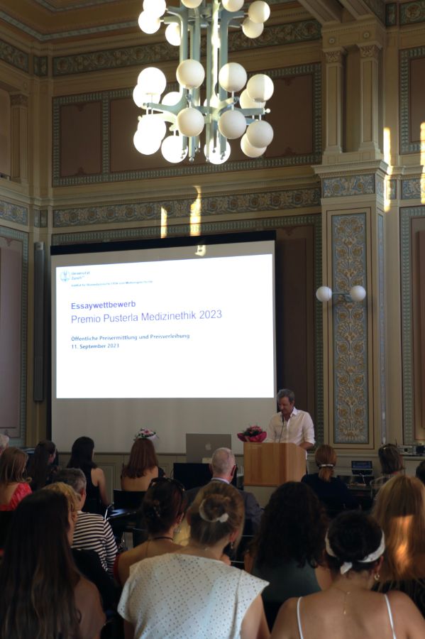 Bereits zum sechsten Mal fanden im September 2023 das öffentliche Finale und die Preisvergabe des Essaywettbewerbs für Medizinstudierende der Universität Zürich im 1. Studienjahr statt. Nach einem Grusswort der Direktorin Universitäre Medizin der UZH, Beatrice Beck Schimmer, trug die bekannte Schauspielerin und Sprecherin Graziella Rossi die drei Texte vor, die es in diesem Jahr in die Endrunde des Schreibwettbewerbs geschafft hatten. Anschliessend präsentierten sich die drei Autorinnen und Finalistinnen selbst dem Publikum und beantworteten der hochkarätig besetzten Jury, bestehend aus Melitta Breznik, Frank Clasemann, Anna Elsner und Christoph Meier, Fragen zu ihren Beiträgen und ihrer Motivation zu schreiben. Nachdem das Publikum die Gelegenheit hatte, in geheimer Abstimmung den besten Essay zu bestimmen, votierten auch die Jurymitglieder für ihren jeweiligen favorisierten Text. Aus diesen Stimmen ergab sich dann die Verteilung der Plätze 1 bis 3 und Nikola Biller-Andorno und Moderator Tobias Eichinger konnten schliesslich die Preise übergeben.