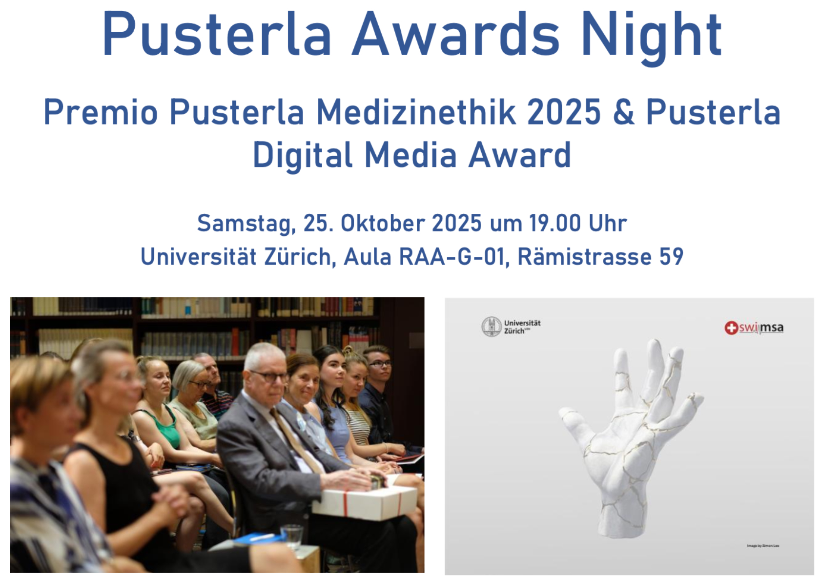 Das Center for Medical Humanities am Institut für Biomedizinische Ethik und Medizingeschichte der Universität Zürich vergibt jährlich den Essay-Preis Premio Pusterla Medizinethik für UZH-Medizinstudierende des ersten Semesters. Der Preis wird vergeben für den besten Essay, der ethische Probleme und Konfliktsituationen in der ärztlichen Praxis und Klinik in literarisch ansprechender Form verarbeitet und darstellt. Bei der öffentlichen Preisverleihung werden die drei Essays, die es in die Endrunde geschafft haben, ausgezeichnet und der beste Text wird live vorgetragen. Ausserdem wird in diesem Jahr in Zusammenarbeit mit swimsa , dem Verband Schweizer Medizinstudierender, zum ersten Mal der Pusterla Digital Media Award vergeben für digitale Bilder und Kurzvideos, die sich mit ethischen Fragen in den Bereichen Gesundheit, Medizin oder Krankheit befassen.